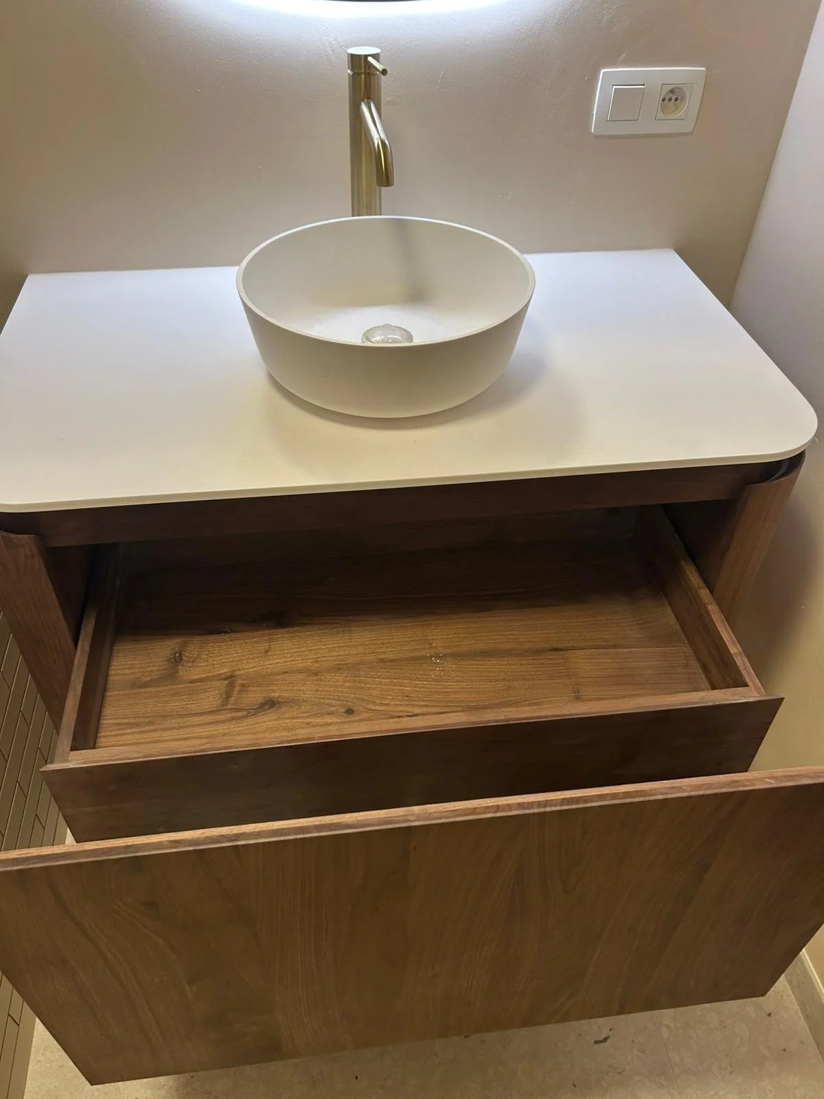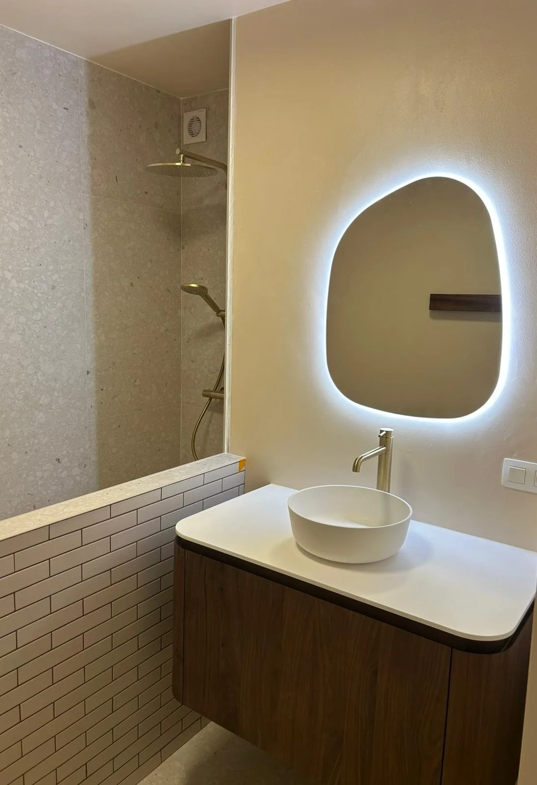 Voor dit project creëerden we een harmonieuze badkamer waarin natuurlijke materialen en luxueuze details samenkomen.